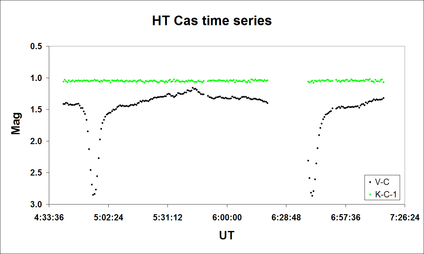 Below is short animation showing the first of two eclipses imaged on November 11, 2010. HT Cas is centered in the frame and a magnitude 13.9 star lies just below it.
